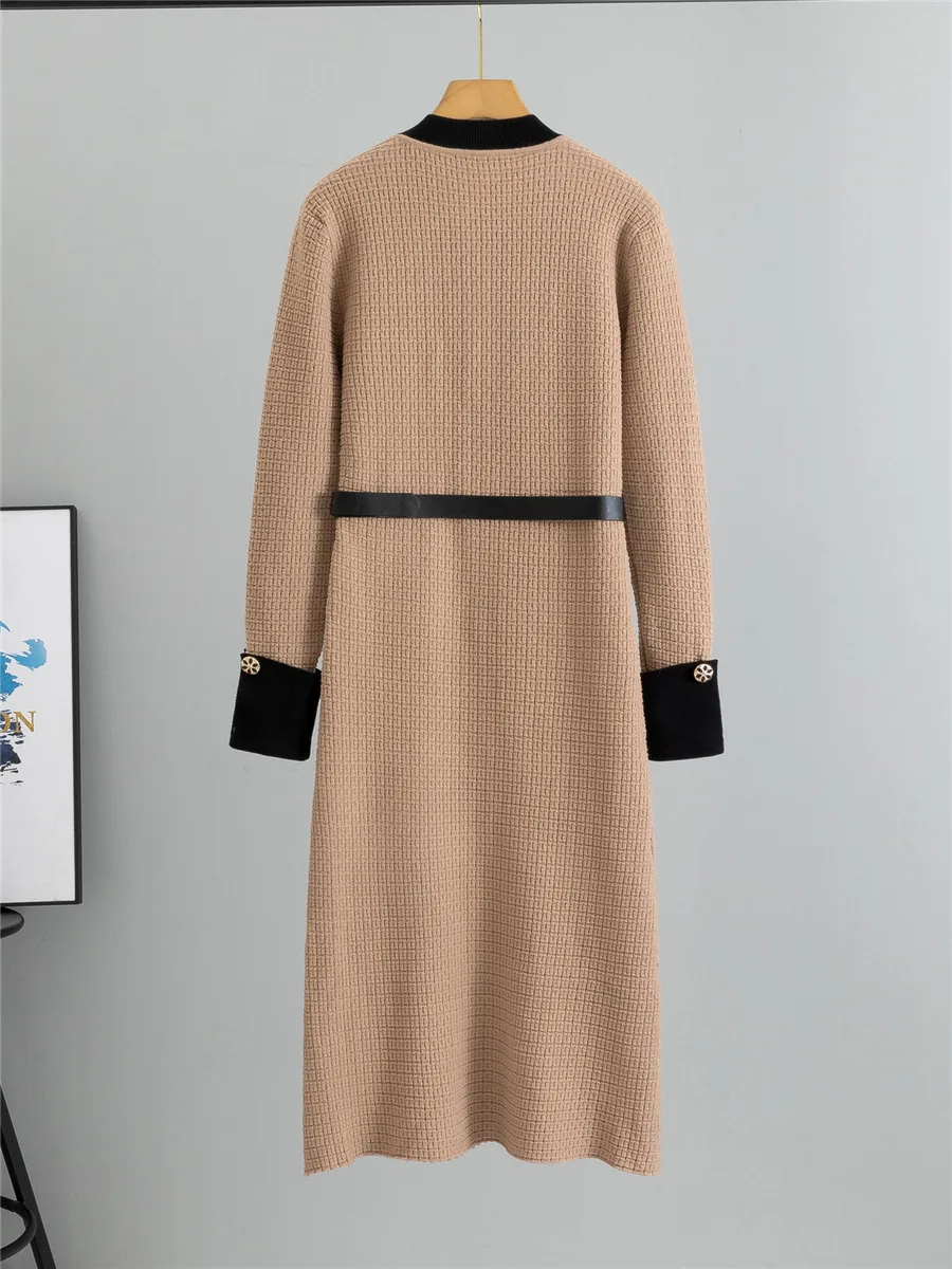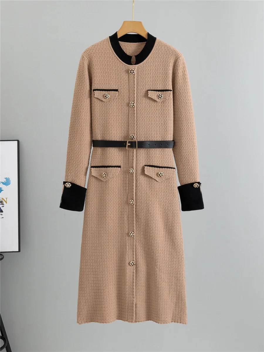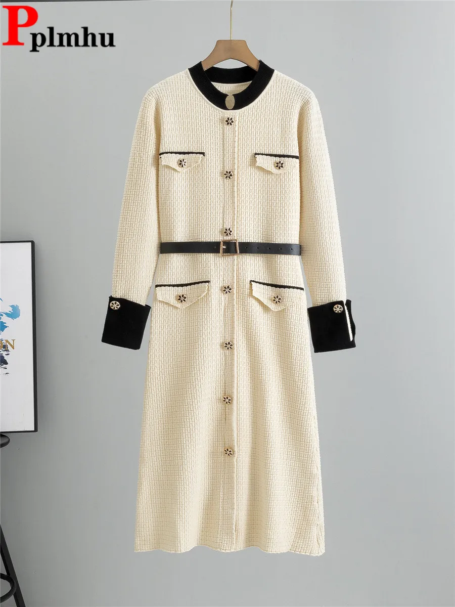 Elegant Fashion A-lined Knit Dress Women O-neck Knitwears Long Sleeve Vestidos Korean Design Slim Mid Length Dresses With Belt